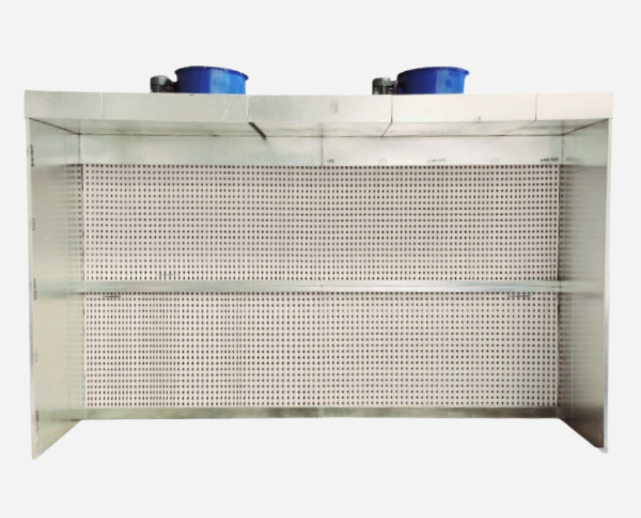 This industrial system features a front access open-face design for easy operation and maintenance, paired with integrated filtration media for high-efficiency particle capture. A centrifugal fan with an IE2 motor ensures powerful, energy-efficient airflow. Cardboard mineral filters and a paint stop filter trap larger particles and overspray, while an IP65-rated ceiling light improves visibility. The wired electrical panel with an emergency start/stop button ensures safety and ease of control.